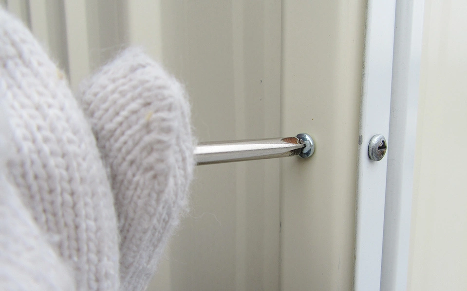 ユーロ物置の組立後に屋根や壁から雨漏りがする場合、多くの原因はビスのましじめにあります。 一般的なプラスドライバーを使用し、手でビスを締めなおしてください。 その後、雨漏りのしていた部分に水をかけて改善を確認してください。