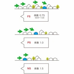 実際に建物に対する遮蔽がどの程度あるのかを数値化したものです。 左図をご参照頂き、設置場所に一番近い図の係数を確認しましょう。