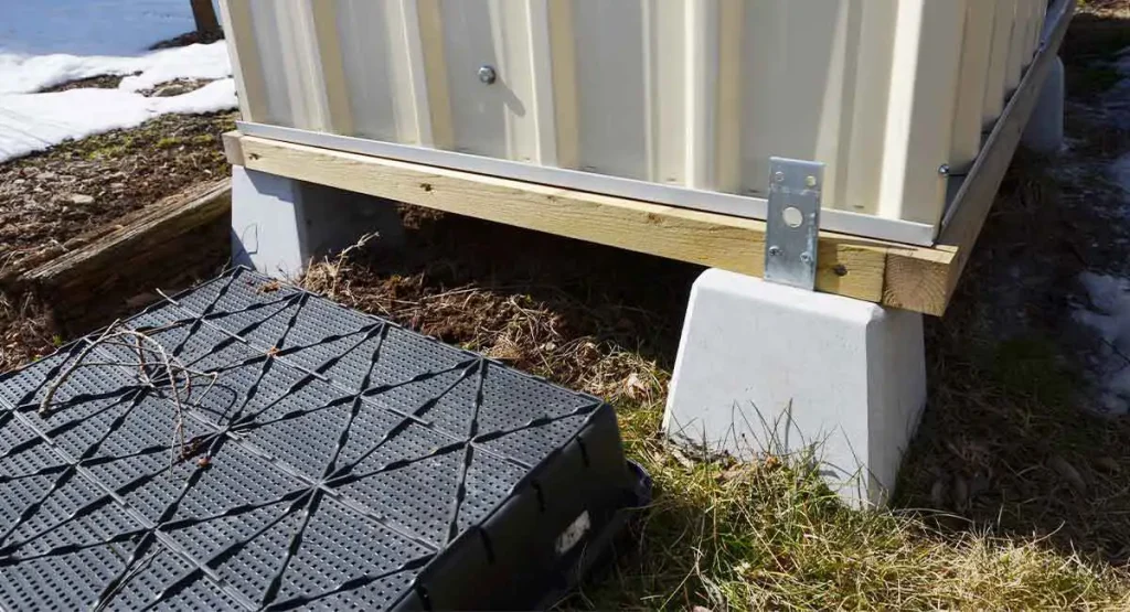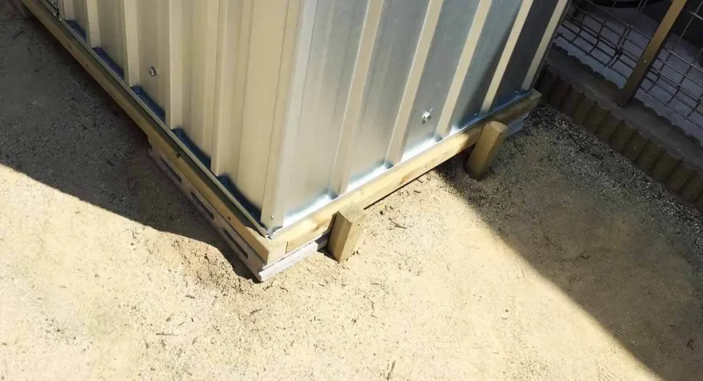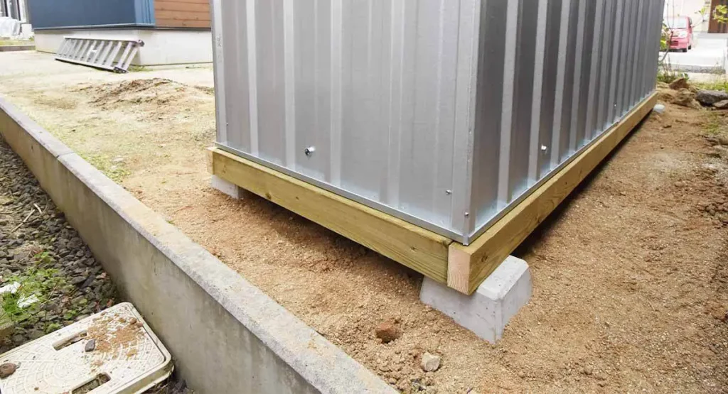 コンクリート基礎の場合は地面に直接施工して基礎と物置をアンカーで固定します。木製床の場合は木製床と地面を杭で固定する必要がございます。